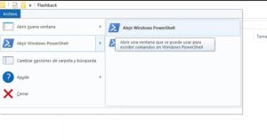 Crearemos una carpeta en nuestro escritorio con el nombre de Flashback y clicamos en ella. Cuando estemos dentro nos dirigimos a Archivo y Abrir Windows PowerShell. Os dejo el archivo de texto con los comandos a copiar en el Windows powerShell Descargar