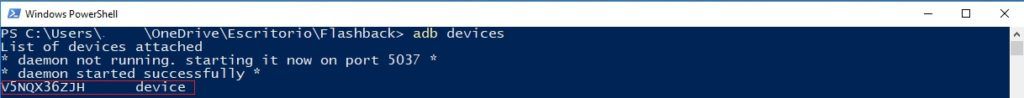 Una vez abierto Windows Power Shell escribiremos el siguiente comando adb devices y le daremos a enter, este comando inicia el servicio. Nos tiene que salir el dispositivo que esta en el recuadro rojo de la imagen.