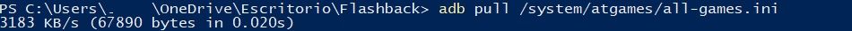 El siguiente comando a introducir es adb pull /system/atgames/all-games.ini y clicamos el botón enter, Este comando copia el archivo all-games.ini en nuestra carpeta Flashback .