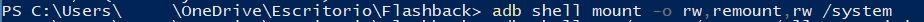 Introducimos el siguiente comando adb shell mount -o rw,remount,rw /system y clicamos el botón enter . Este comando permite modificaciones a la carpeta del sistema de nuestra consola.