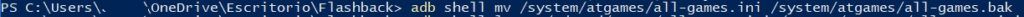 El cuarto comando añadir adb shell mv /system/atgames/all-games.ini /system/atgames/all-games.bak y clicamos el botón enter. Este comando crea una copia de seguridad de los juegos originales con extensión .ini