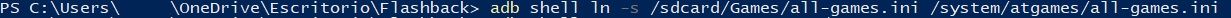 El siguiente comando crea enlace simbólico desde all-games.ini original. Copiamos el siguiente comando adb shell ln -s /sdcard/Games/all-games.ini /system/atgames/all-games.ini.