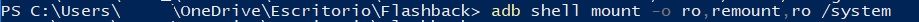 Y el ultimo comando añadir restaura el estado original de solo lectura a los archivos del sistema. adb shell mount -o ro,remount,ro /system.