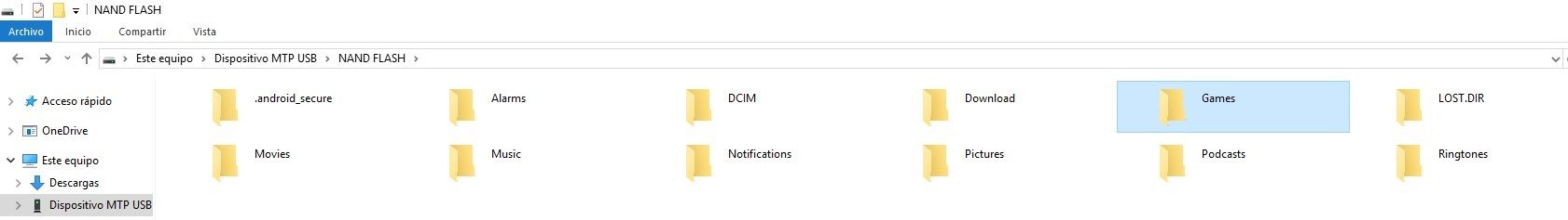 Terminado de configurar el archivo all-games.ini con los juegos a instalar volvemos a la consola, maximizamos la carpeta Nand Flash si todavía la teníais minimizada y si no a través del dispositivo MTP USB tal y como se muestra en la imagen